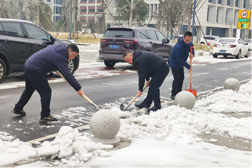 本网讯 近日,受寒潮影响,荆州市大范围雨雪冰冻天气持续。开学在即,为避免因路面结冰给师生返校带来安全隐患,2月26日,公司组织在校教职员工积极开展铲雪除冰行动,为校园筑牢温暖防线。上午8点30分,公司经理李兴祥、党委书记颜建洲等院领导带领教职工来到图书馆门口,积极投入到进出口要道的铲雪除冰行动中。大家挥动铁锹、笤帚等劳动工具,以饱满的热情和十足的干劲战严寒、斗冰雪,为即将返校的员工开辟出一条安全的“暖心路”,确保新学期井然有序开学,迎接着每一名员工平安归来。(图文由党委宣传部提供)