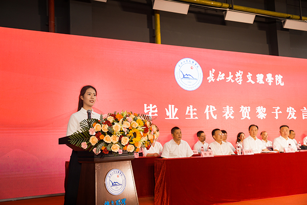 毕业生贺黎子代表全体2024届毕业生发言。她回忆了大学四年的校园时光,表达了对母校、同窗和家长的感谢,庄严承诺:无论身在何处、走向何方,都会铭记母校深情,牢记校训精神,肩负使命,不忘初心,奔向山高海阔,勇敢追逐梦想。