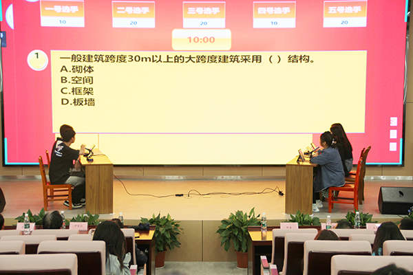 决赛包括"单枪匹马"必答题、"奋勇争先"抢答题、"知难而进"风险题和观众互动答题等环节,采取累积计分制评分,竞赛题目涉及党史类、法学类、金融类、人文类、传媒类、外语类、管理学类、体育类、机械类、计算机类等多个类别。现场抢答环节扣人心弦,各院系选手在智力比拼中奋勇争先,台下观众在互动环节踊跃发言,精彩瞬间赢得阵阵掌声。经济与法学系专任教师对选手表现作点评。