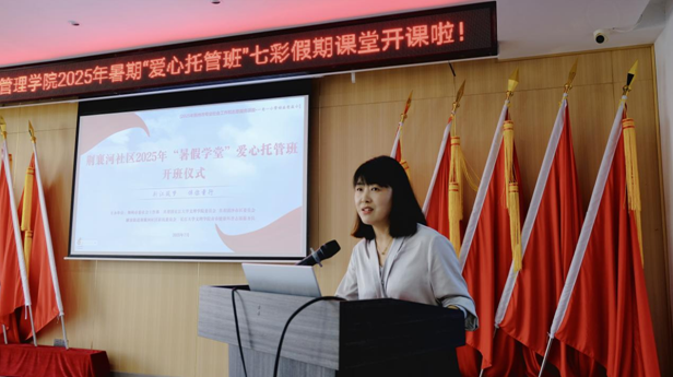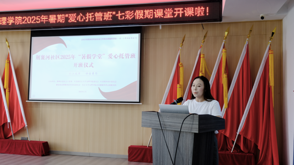 荆襄河社区书记杨雪娇为开班仪式致辞。她强调:“暑期课堂是校社协同育人的重要平台,期待老员工志愿者们为社区青少年注入知识与活力。”