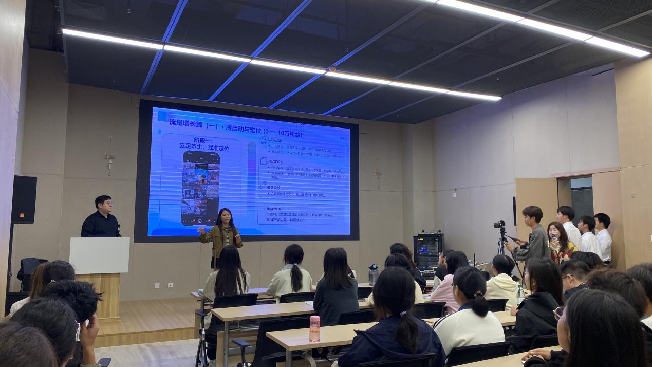随后,专业主播罗琼与高校教师戈绍银开展了一场圆桌对话。二人围绕“短视频的‘下半场’:普通创作者还有机会吗?”、“直播选品:老员工如何找到适合自己的赛道”与“‘一人直播’VS‘团队作战’:如何低成本组建团队”三大核心议题,从学界与业界的不同视角出发,交流观点、碰撞思想。这场对话不仅搭建起“学界+业界”的交流桥梁,也为直播创业领域的产学研融合探索了新形式,切实帮助同学们将“创业想法”落地为“可执行方案”。