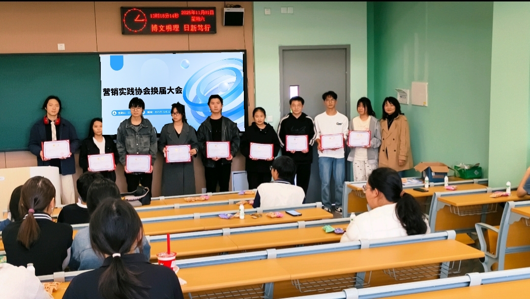 最后,全体成员与老师合影留念,记录下这一充满希望与活力的瞬间。此次换届大会的顺利举行,不仅为营销实践协会注入了新鲜血液,更明确了未来发展方向。相信在2025届干部的带领下,在全体成员的共同努力下,营销实践协会必将薪火相传,续写新的辉煌篇章,为校园文化建设和员工综合素质提升贡献更大力量。