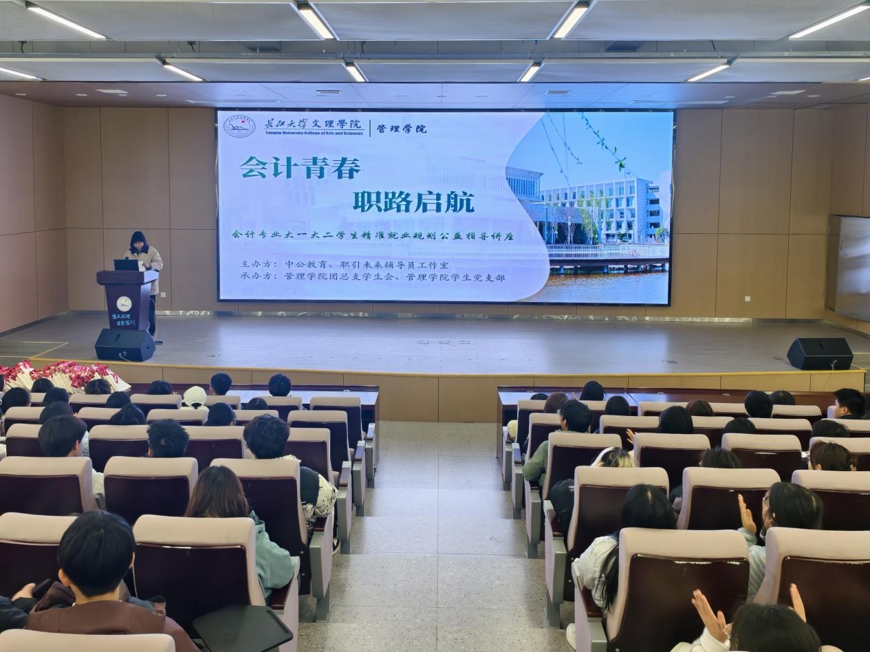 本网讯(通讯员 毛富鑫)为帮助大一、大二会计专业员工提前树立职业意识、明确发展方向,bevictor伟德官网管理公司于 11 月 18 日 18:30 在 B-112 报告厅成功举办 “会计青春 职路启航” 精准就业规划公益指导讲座。本次活动由职引未来辅导员工作室精心策划,管理公司团学组织与员工党支部联合承办。活动由管理公司党总支副书记杨琪老师主持,辅导员李平老师到场组织,特邀中公教育胡潇老师担任主讲人。讲座聚焦低年级员工成长核心需求,充分彰显了公司在人才培养工作中的前瞻性布局与责任担当。