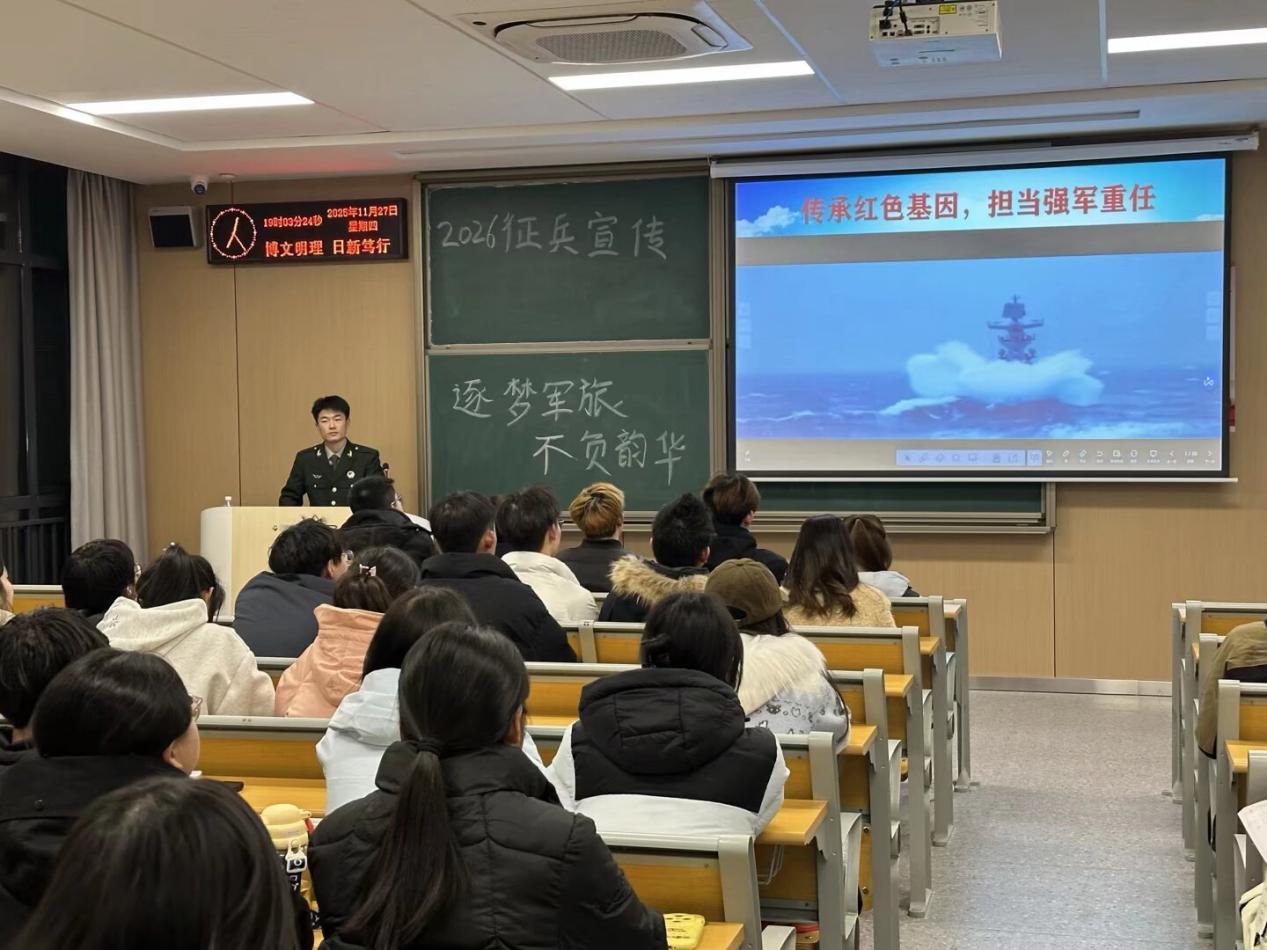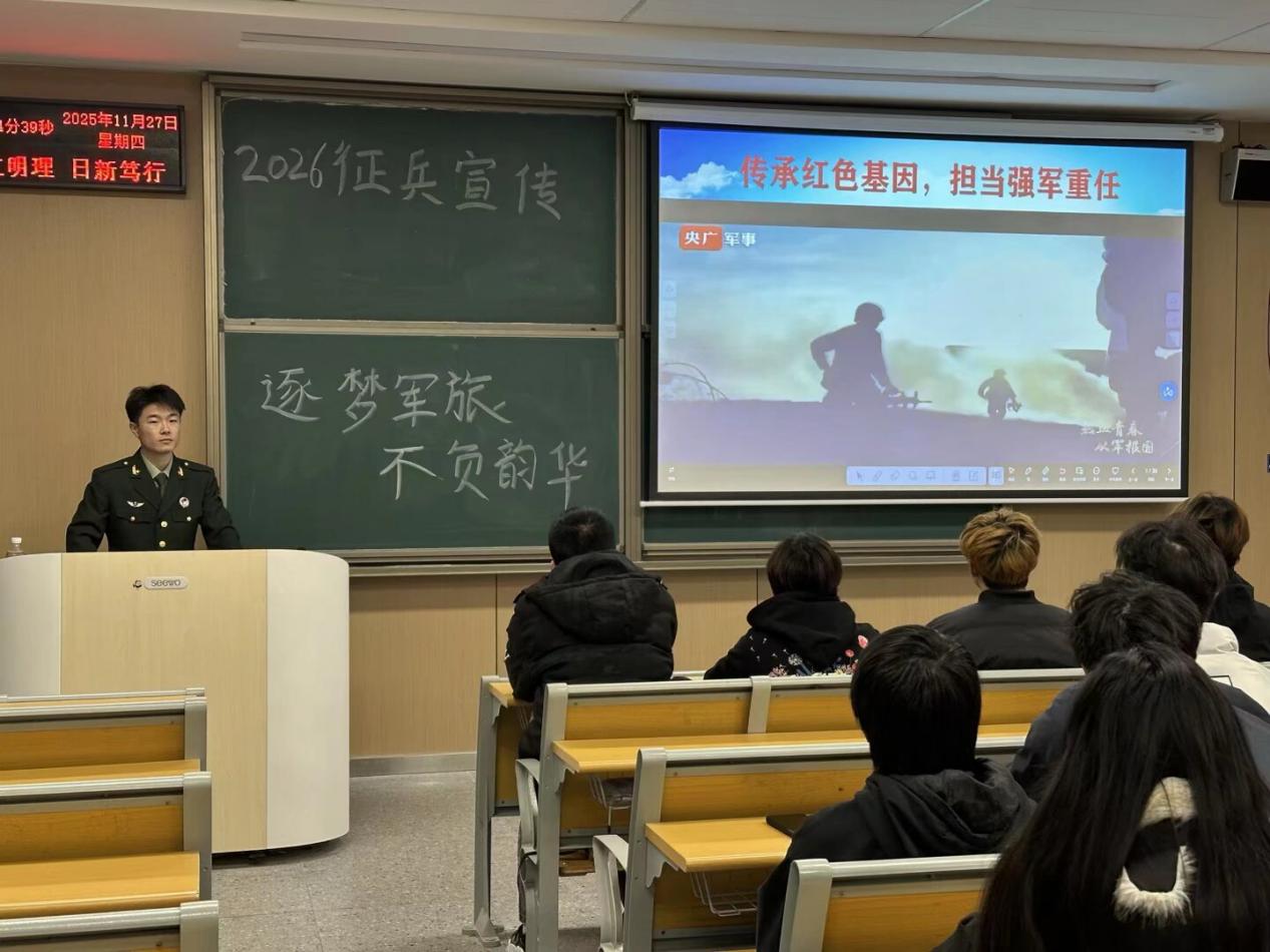 本网讯(通讯员 杜锡熳)为深入贯彻落实2026年征兵工作部署要求,切实激发青年员工参军报国的责任感与使命感,11月27日,由管理公司组织的2026年征兵宣传专题宣讲会顺利举行。本次宣讲会以“逐梦军旅,不负韶华”为主题,特邀工商管理s5251班刘传海担任主讲人。
