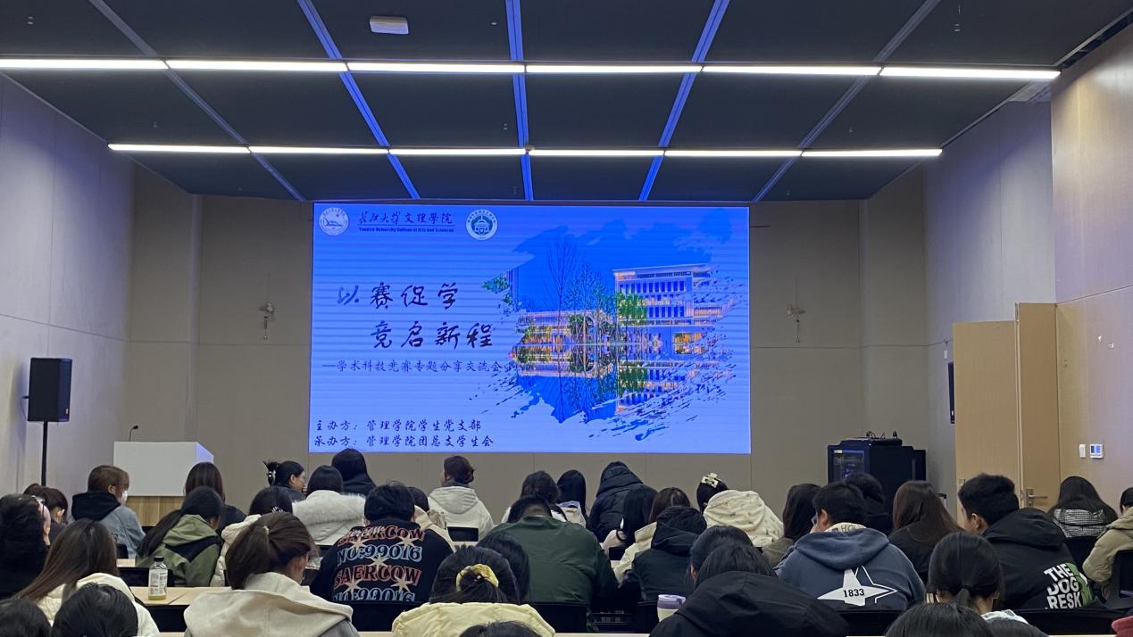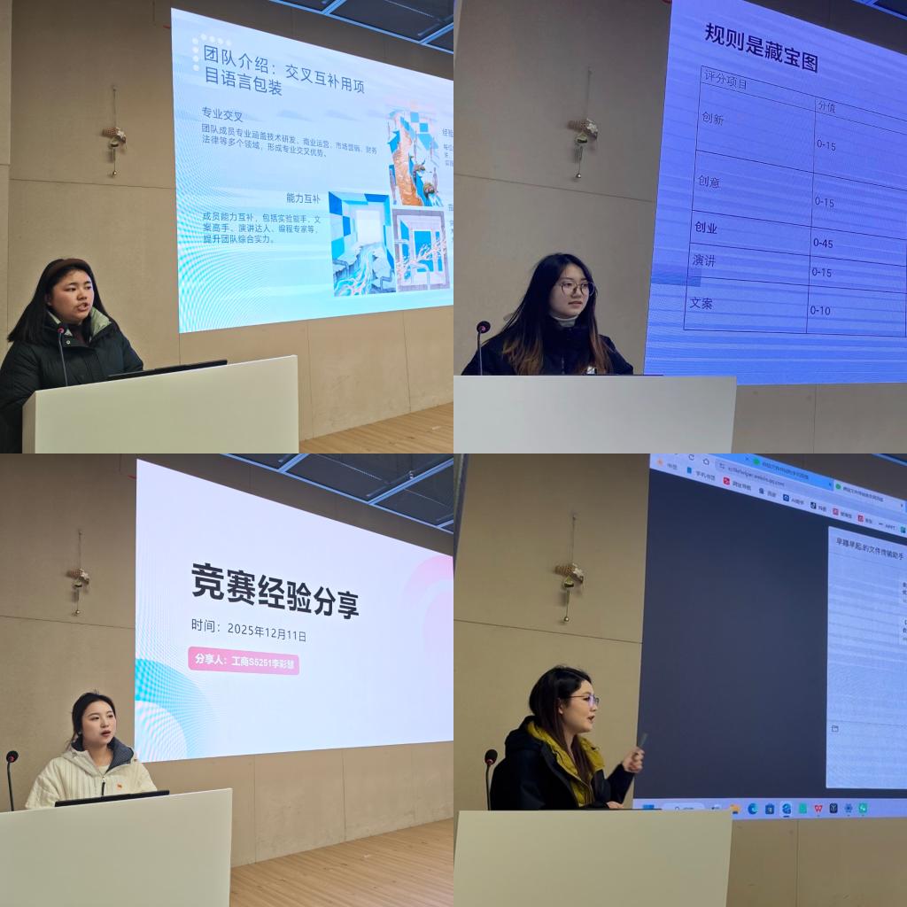 本网讯(通讯员 王钧玉)为推进实践教学体系的建设与创新,搭建竞赛经验传承平台,助力员工实践能力提升,bevictor伟德官网管理公司于2025年12月11日下午16:15在图书馆103报告厅成功举办“以赛促学·竞启新程”学术科技竞赛专题分享交流会,本次交流会由管理公司员工党支部主办、管理公司团总支员工会承办,青年发展部唐凌锴主持,特邀在“挑战杯”、“三创赛”等竞赛中屡获佳绩的万学君、秦恬茨、李彩慧和朱雨露四位优秀学子担任分享嘉宾,管理公司各级同学共同参与。