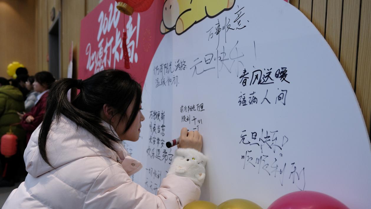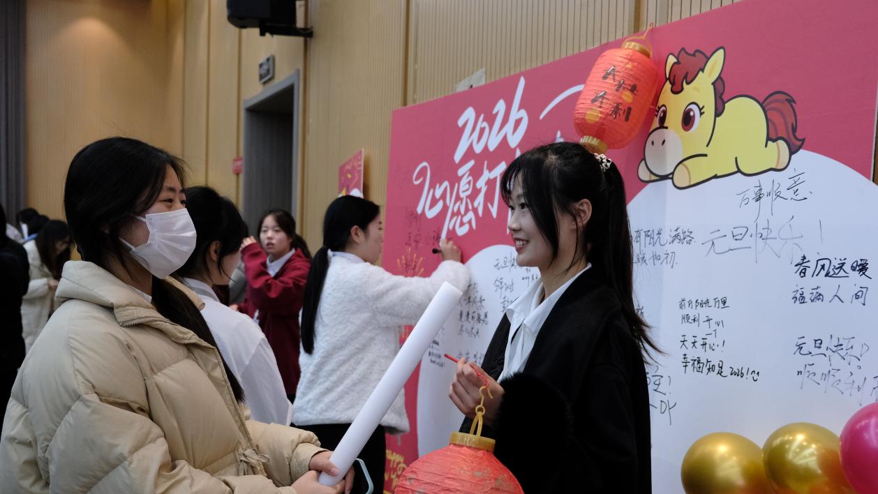 活动开场前,场外的签名采访区热闹非凡,到场的师生们纷纷在签名板上写下诚挚心愿。工作人员上前采访,面对镜头,大家畅所欲言,将对新年的期盼与愿景娓娓道来,温馨的氛围感染着在场的每一个人。