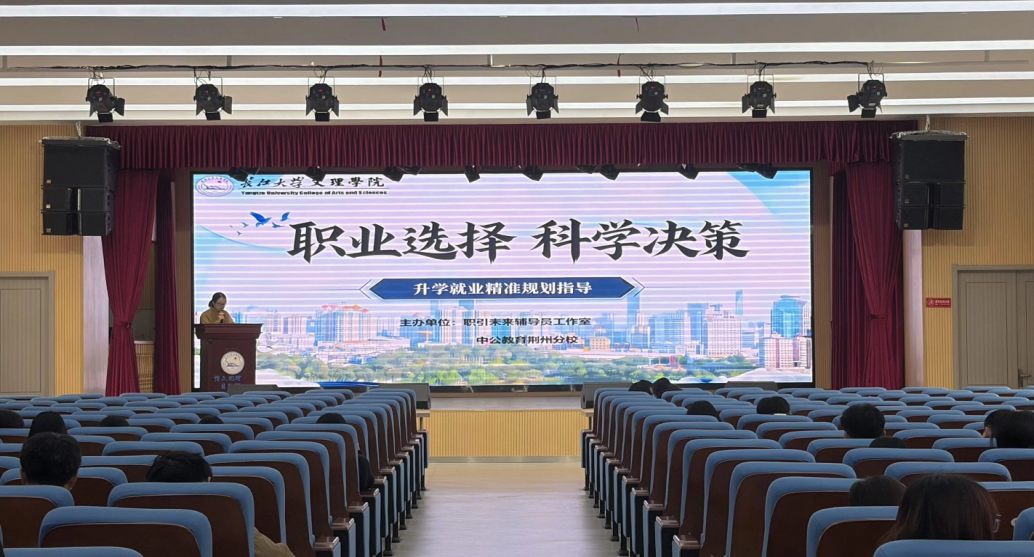 3 月 24 日晚,由职引未来辅导员工作室与中公教育荆州分校联合主办的 “职业选择 科学决策 —— 升学就业精准规划指导” 讲座,在主校区教学楼 B-112 报告厅顺利开讲,讲座面向 2023 级全体本科生,吸引众多学子到场聆听交流。本次讲座由辅导员沈诗涵老师担任主持人,她以平实亲切的表达迅速带领同学们进入讲座主题,为活动开展营造了良好氛围。