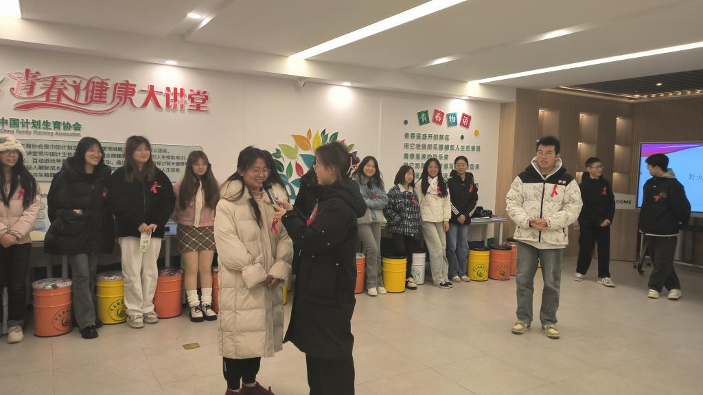 在校内湖北省青春健康教育基地,由主持人周静如带领员工开展《预防艾滋病》同伴教育,通过“野火游戏”游戏,让青年朋友亲身体验艾滋病病毒传播速度、途径及感染者的内心感受,增强对艾滋病感染者的理解,提高对艾滋病病毒传播的警觉性。活动中通过问答讨论环节不断延伸课程内容,鼓励参与者从个人的角度积极投入到艾滋病预防和关怀的工作中。