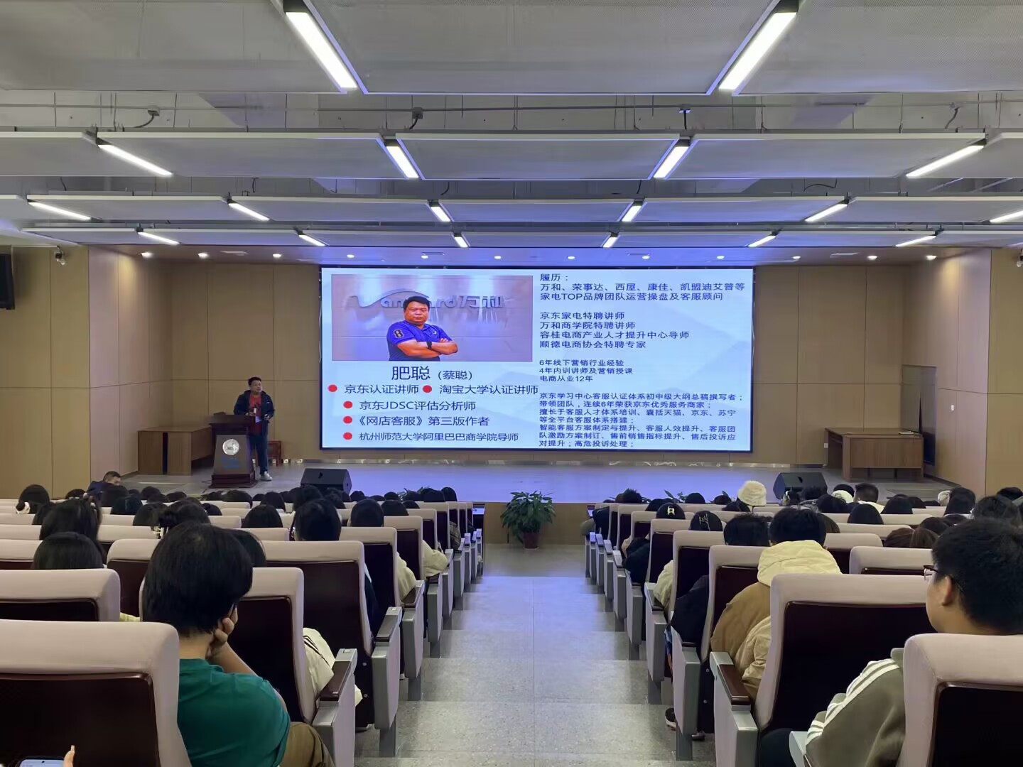 本网讯(通讯员 郭秋茗)为让同学们更深入了解电子商务这门专业,学习相关专业技巧,2023年11月16日下午19:00,管理公司于B-112报告厅召开关于电商销售技巧的讲座,杭州师范大学阿里巴巴商公司导师蔡聪为此次讲座主讲人。