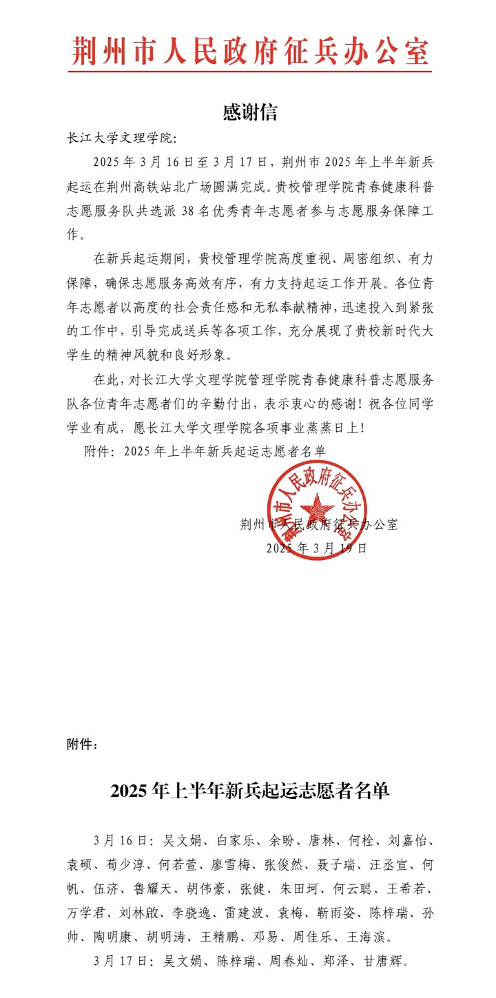 本网讯(通讯员:陈梓瑞 袁梅)3月19日,管理公司传来喜讯:公司38名青年志愿者因在荆州市2025年上半年新兵起运活动中表现卓越,荣获荆州市人民政府征兵办公室的感谢信。