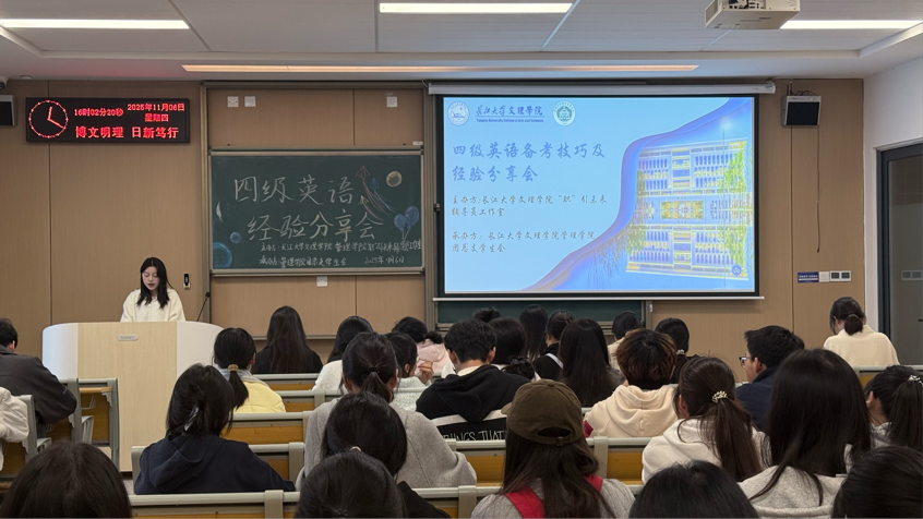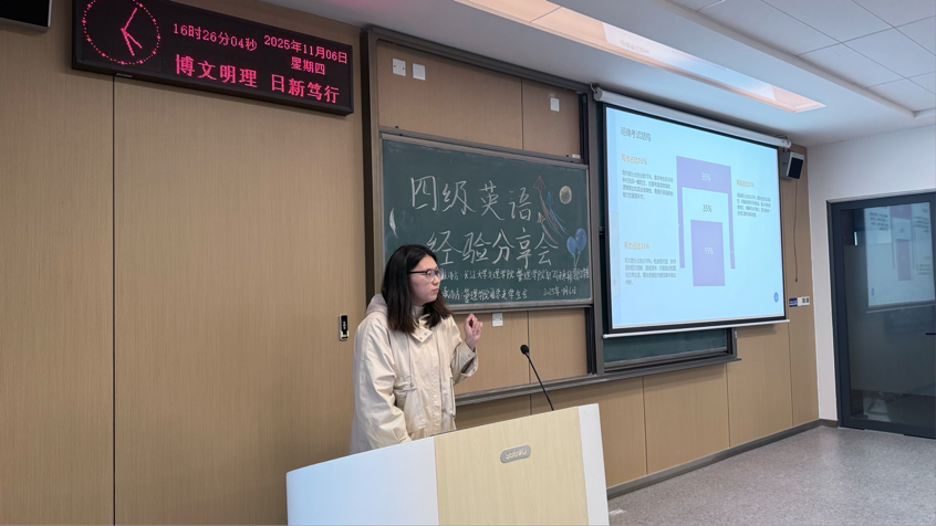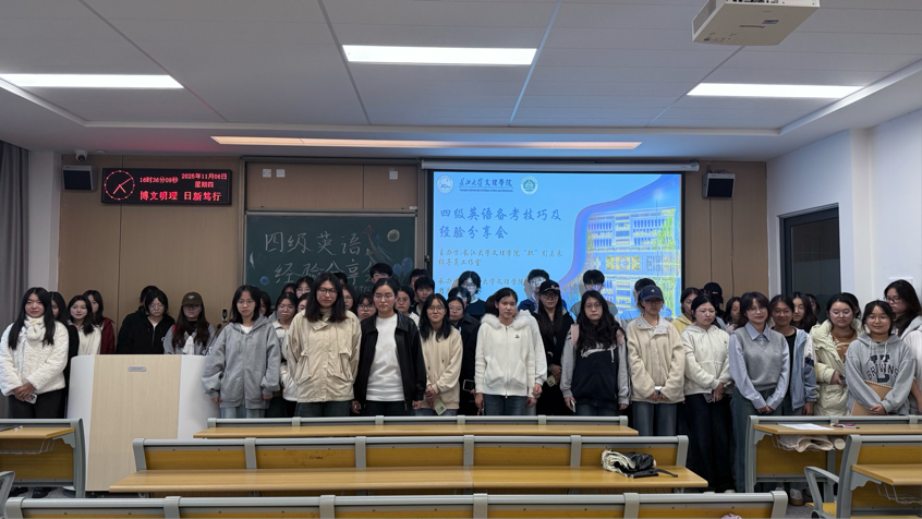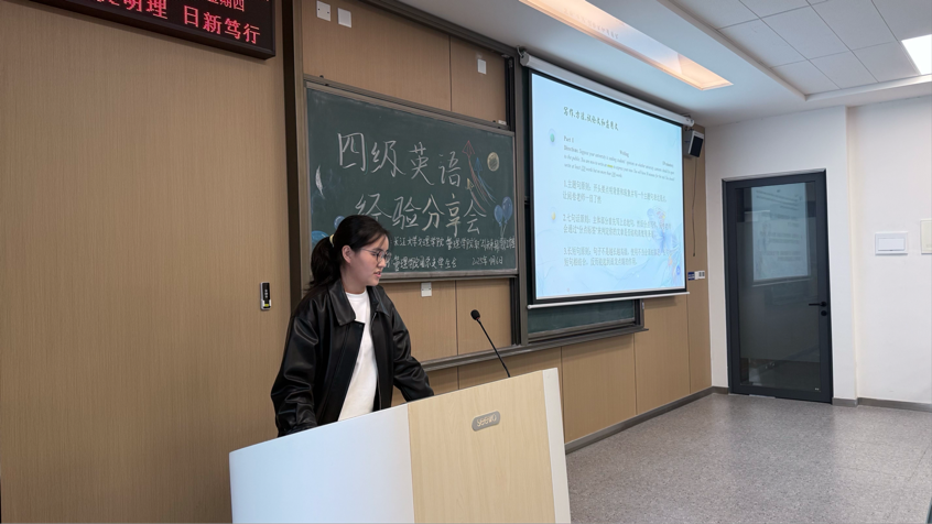 本网讯(通讯员 梁若暄)为帮助同学们更好地备战大学英语四级考试,提升应试技巧与信心,管理公司于2025年11月6日(周四)下午16:00,在C-422教室举办“四级英语备考技巧及经验分享”活动。活动特邀两位高分通过考试的同学——注会5231班吴文娟和张文力,围绕听力突破、阅读提速、翻译得分、写作技巧等核心模块展开分享,助力员工们高效复习,精准提分!本次分享会由会计类5251班王李娟主持。