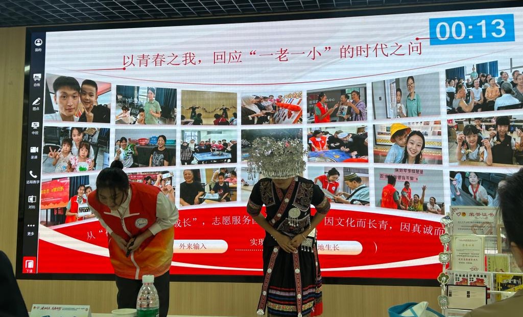 本次省赛服务队创新表现形式,采用一问一答式,一名队员扮演社区主任与主讲人互动,配合着PPT和物料展示,有效地将服务内容及成效清晰地呈现出来。