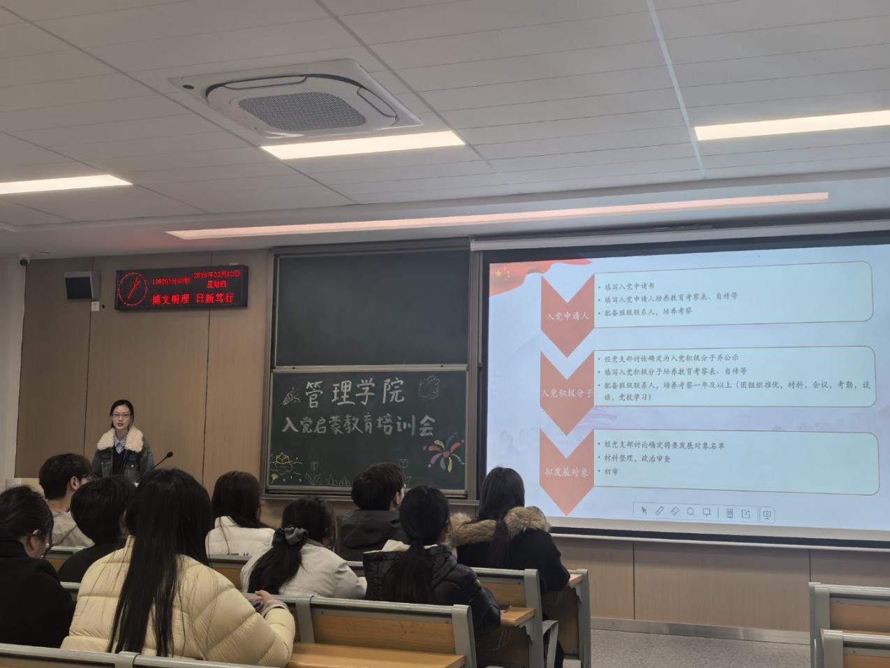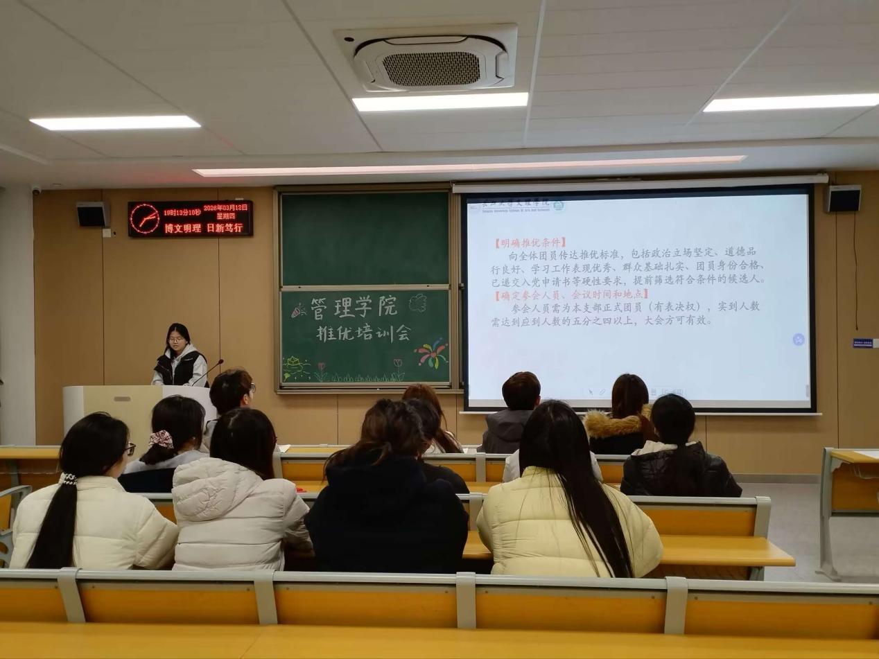本网讯(通讯员 胡昌彬)为进一步夯实基层团组织建设,强化团支书的思想引领能力与团务工作实操水平,引导广大团员青年积极向党组织靠拢。2026年3月12日晚19:00,管理公司团支书培训会在C-417M教室顺利举行。会议分为入党启蒙教育、推优工作实务培训两个核心环节。本次培训会由管理公司员工党支部成员何若萱和管理公司团总支员工会组织建设部部长高静玉主持,25级全体团支书参会。