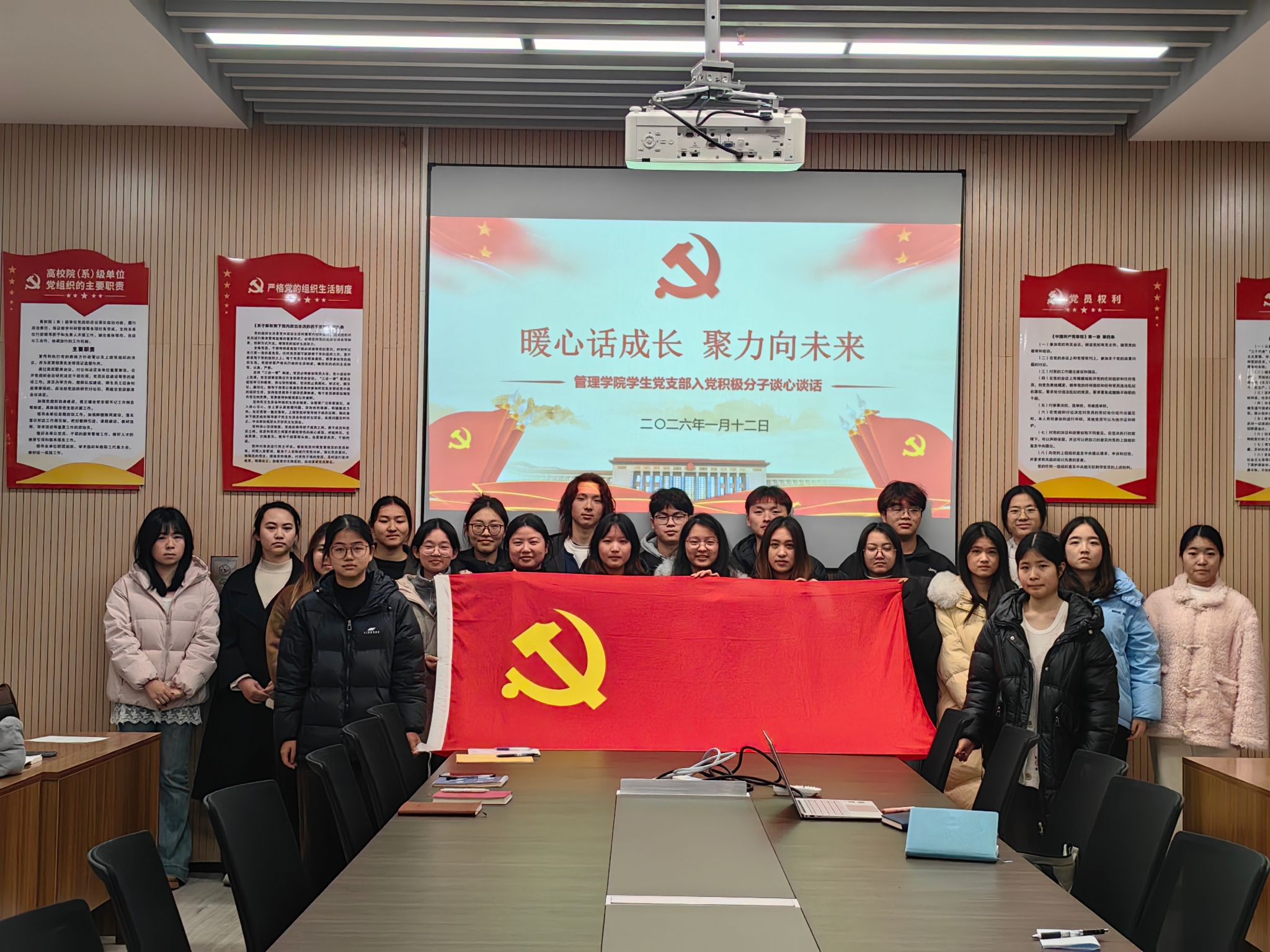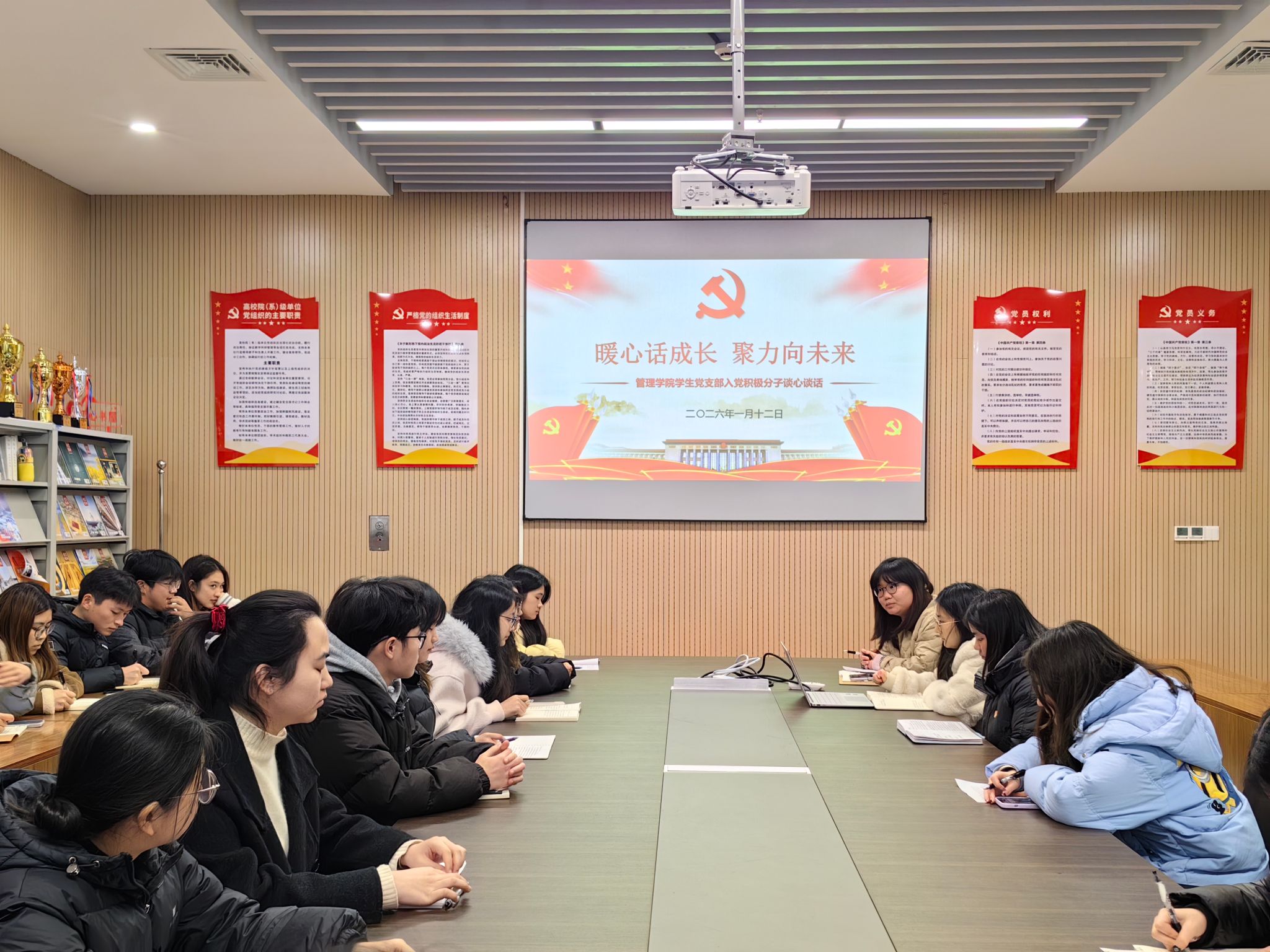 本网讯(通讯员 黄江琴)为进一步了解入党积极分子思想动态、学习状况和现实表现,进一步加强党员发展的培养与考察工作,筑牢党员发展质量。1月12日下午,管理公司员工党支部在图书馆532会议室组织开展了“暖心话成长,聚力向未来”入党积极分子座谈会。会议由员工党支部书记杨琪主持,党支部组织委员兼纪检委员王希若、宣传委员万学君及29名入党积极分子参加会议。