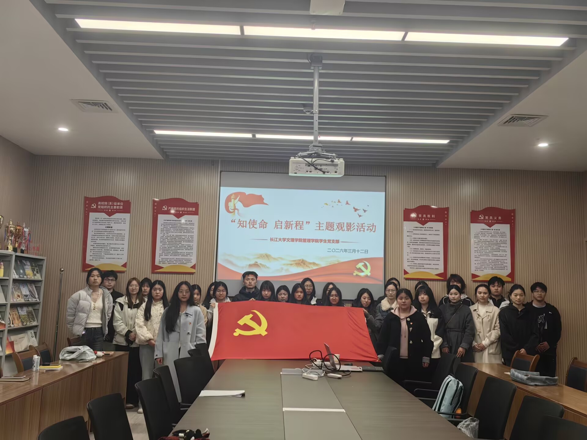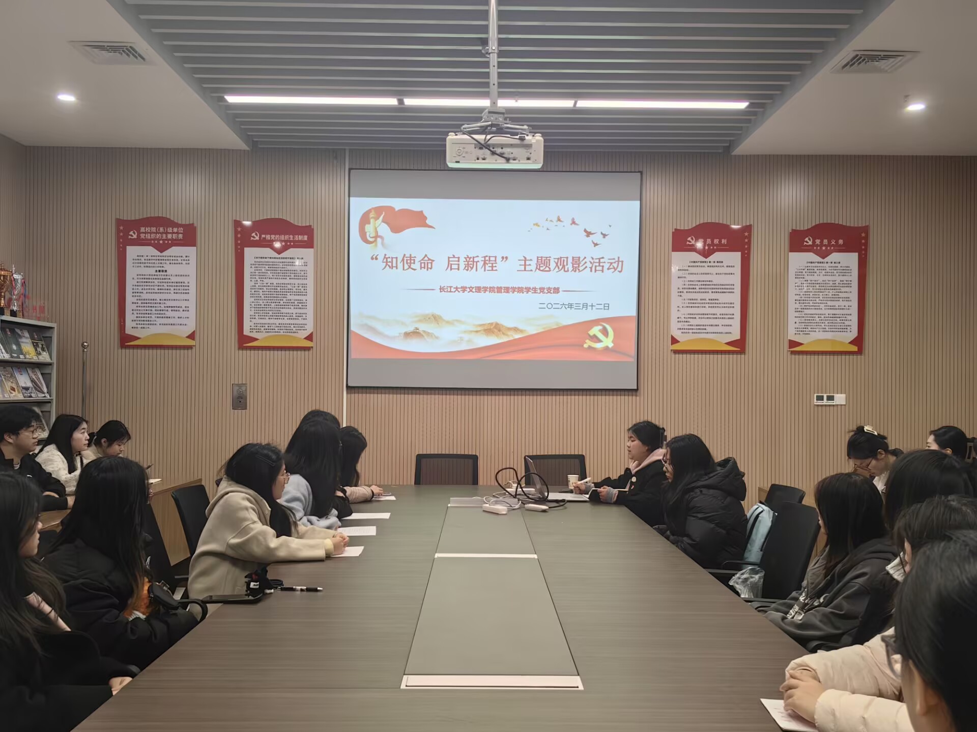 本网讯(通讯员黄江琴)为进一步加强爱国主义教育,引导青年员工党员铭记历史、珍爱和平,厚植家国情怀,坚定理想信念,管理公司员工党支部全体党员同志于3月12日18:00,分别在图书馆532与城中校区同步开展了以“知使命,启新程”为主题的观影活动。