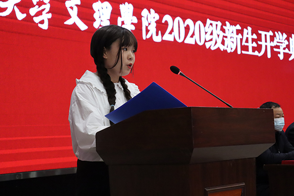 高职部周增代表新生发言。“天行健,君子以自强不息;地势坤,君子以厚德载物。”他引用《周易》中的句子,代表新生宣誓:一定满怀希望、追逐理想,脚踏实地、勤奋学习。在人生新的起点,播下希望的种子,向未来扬帆起航,期盼每一分付出,都拥有沉甸甸的收获。