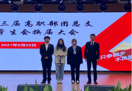 大会第三项;书记为第三届高职部团总支员工会主席团及部长颁发纪念品,之后进行部门交接仪式,第三届各位部长为第四届届各位部长佩戴工作牌。