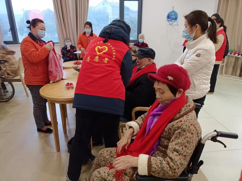 图志愿者为老人们佩戴围巾