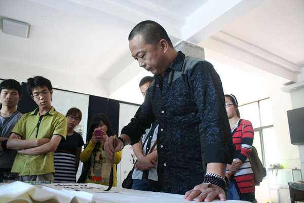 本网讯(见习记者 沈琦 邹青青)5月11日上午,一教二楼大厅翰墨飘香,丹青耀眼,泮池五月风系列活动之“泮池书韵”书画展在此举办,经理沈光明、荆州市知名书法家朱道卫、杨旻、毛志华等老师亲临现场,为同学们点评字画。