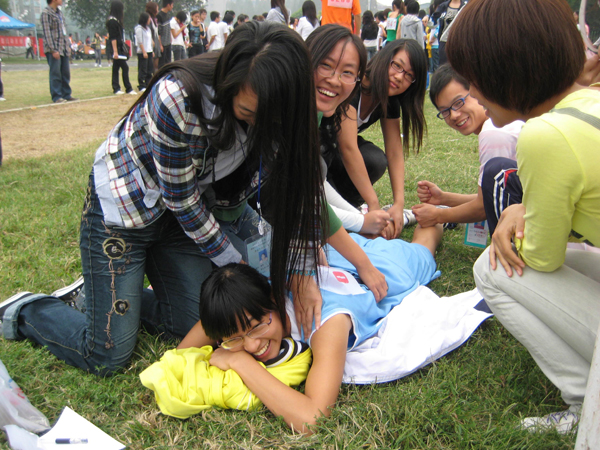 “来,快趴下,我帮你捶捶腿!”管理学部的罗晓丽同学跑完100米后,感觉腿上的肌肉都绷得很紧,腿也酸痛无力,她们班上的一群同学立马围上来,赶紧让她趴在草坪上,大家便都开始忙了起来,有的帮她捏肩膀,有的帮她捶腰,还有的帮她拍腿上的肌肉使腿上的肌肉恢复弹性。在“工作”的过程中,大家还不时地跟她说着玩笑话,尽量逗她开心,以调整她的情绪,大家忙了大约半个小时后,才让罗晓丽起来。据罗晓丽介绍,每次参加体育项目时,总能在终点看到同学们熟悉的身影和可爱的笑脸,感觉特别温馨,这也给了她拼搏的动力。“她为了班级的荣誉在运动场上挥洒着汗水,我们为这位班级的英雄做点事也是应该的。”正在帮罗晓丽捶腿的李同学笑着说。