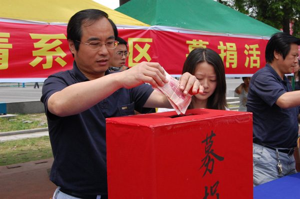 为了发扬人道主义精神,汇具文理人的无限真情。5月14日公司团委组织了“情系灾区、抗震救灾”大型募捐活动。中午12时募捐启动仪式在老篮球场举行,公司副书记汪邦柱宣读了募捐倡议书。随后在全院领导、教职工的带领下,在场的同学纷纷自发进行了捐款,在此次启动仪式上共捐得资金14000余元。结束后,老师、同学们仍络绎不绝的赶来捐款,并不肯留下自己的姓名,他们表示用自己的点滴爱心,为灾区人民捐款,为灾区人民贡献绵薄之力是每一个中国人都应该做的。