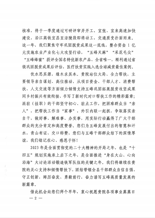 信中提到,2022年,公司领导亲自谋划、高位推动,从项目资金、干部人才、消费帮扶、人文交流等方面倾力倾情支持五峰巩固拓展脱贫攻坚成果同乡村振兴有效衔接,书写了新时代对口帮扶工作的精彩篇章;派驻的干部坚守初心、驻点工作,把困难群众当“亲人”,把帮扶工作当“家事”,外引内联一起抓、争取落实亲自干,做好事、解难事、办实事,用实际行动赢得了广大群众的充分肯定和高度赞誉。