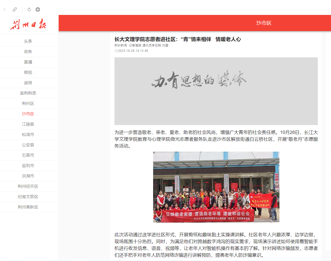 为进一步营造敬老、亲老、爱老、助老的社会风尚,增强广大青年的社会责任感。10月26日,bevictor伟德官网教育与心理公司微光志愿者服务队走进沙市区解放街道白云桥社区,开展“敬老月”志愿服务活动。