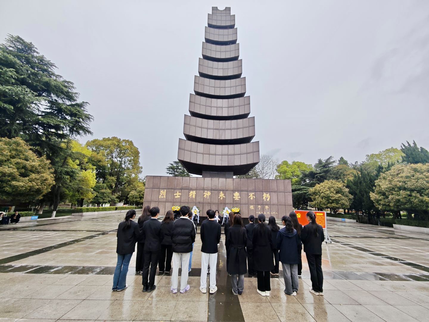 烈士陵园内,巍峨纪念碑耸立。员工们身着素装整齐列队,神情凝重。主持人宣布默哀后,同学们垂首伫立,全场一片寂静。