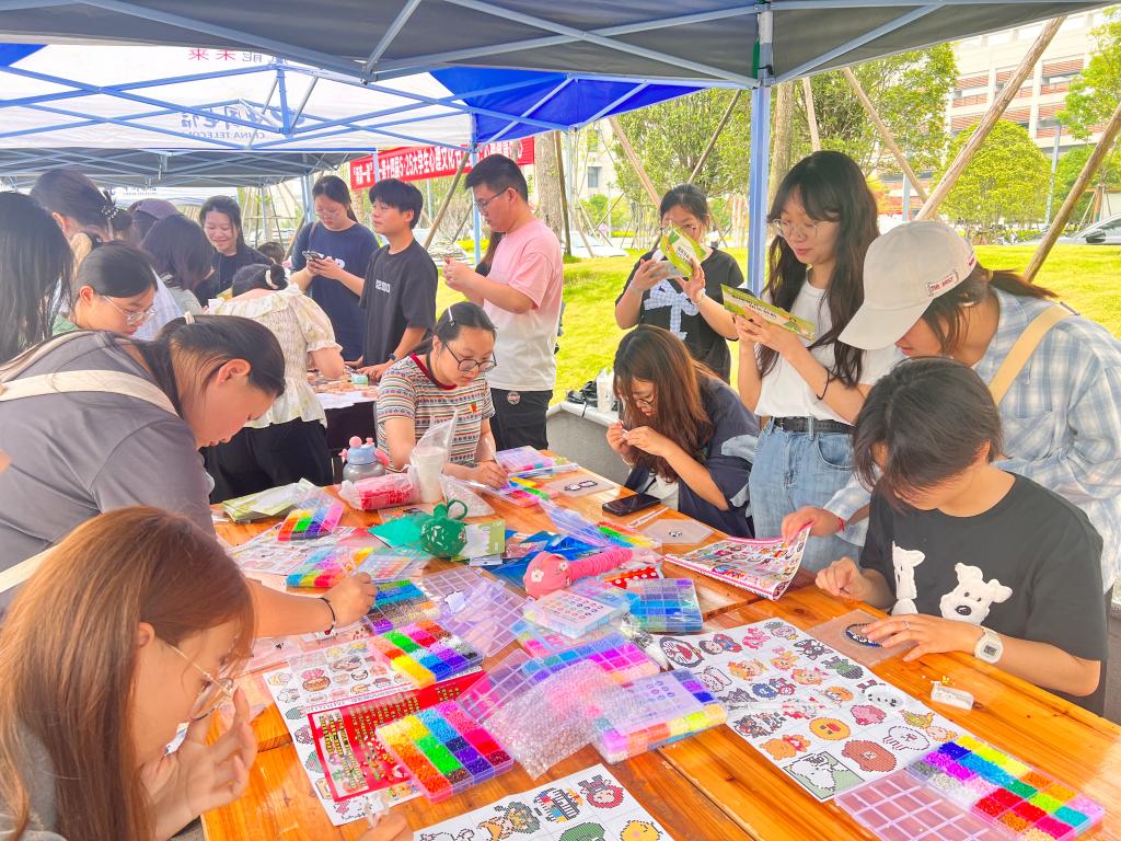 “拼豆豆”手工体验。同学们自由选择五彩豆粒,在模板上拼出心形、花朵、卡通形象等图案,再通过热熨固定成精美挂件。从挑选颜色、排列造型,到用熨斗加热定型,每一个步骤参与活动同学都全神贯注、精心操作。