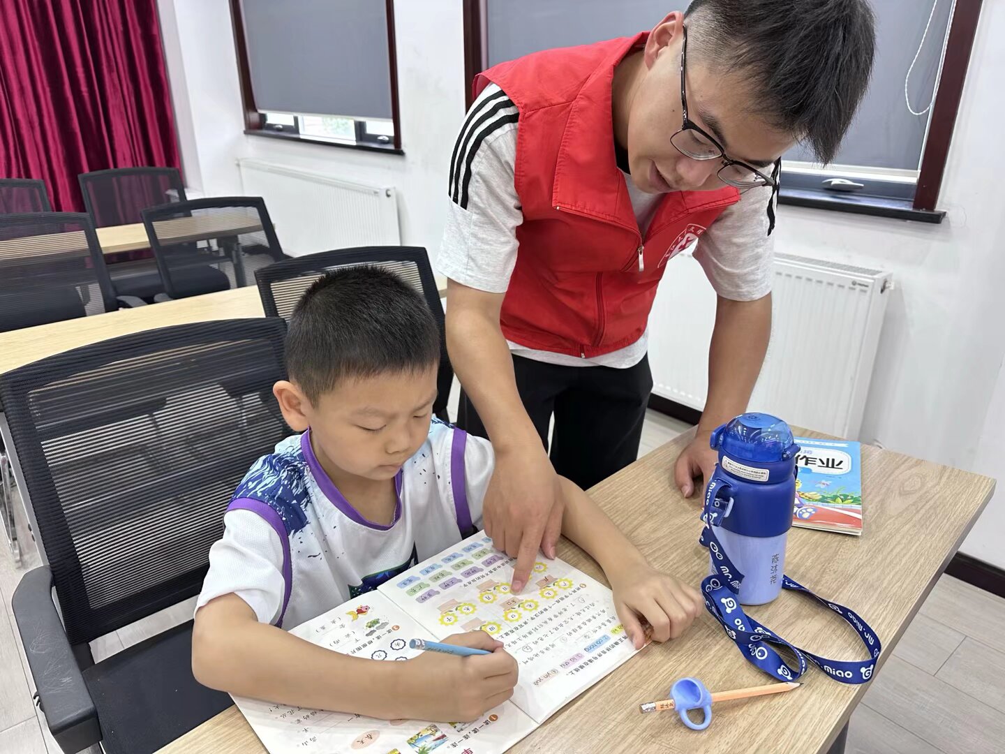 志愿者们分散在孩子们中间,认真辅导大家完成日常作业。遇到不会的题目,他们细致讲解;看到写错的地方,便耐心指正。孩子们低着头认真书写,偶尔抬头提问,整个房间里充满了安静又专注的氛围。