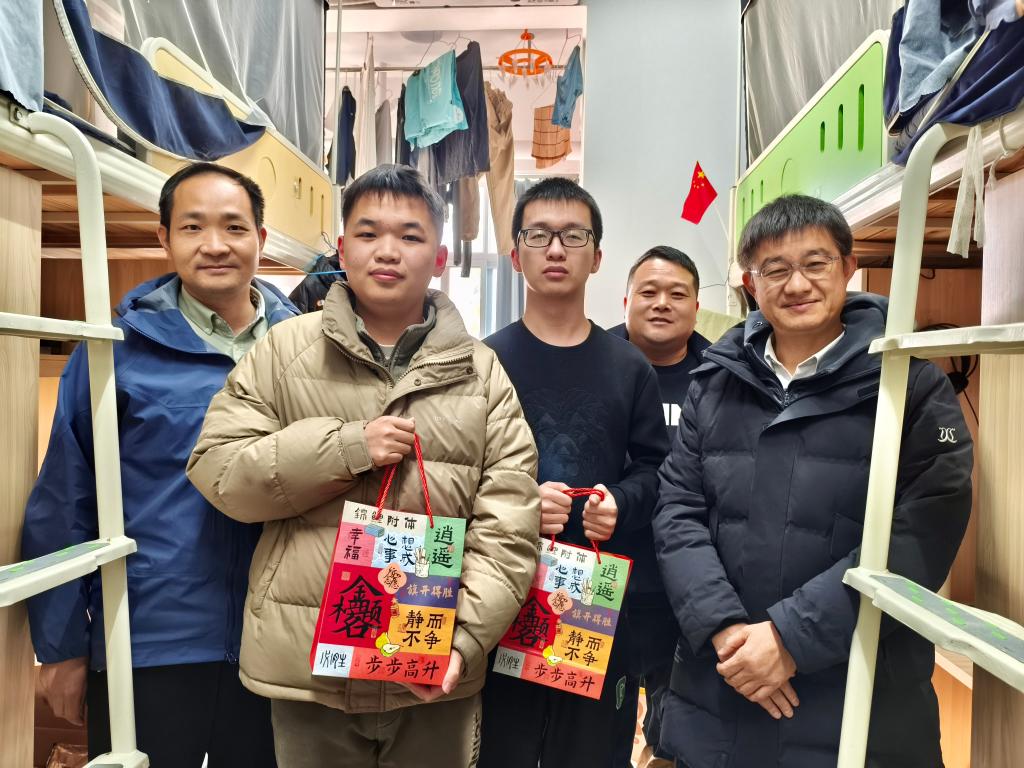 本网讯(通讯员鲁盼/文 熊超峰 王思雨/摄)为进一步做好有温度的教育,助力2026届考研学子冲刺备考,传递公司的温暖与关怀,12月15日下午,公司经理付兵、党总支书记吴海良、党总支副书记王大专带队,和辅导员老师们组成一支慰问队,深入员工宿舍,为员工送上“考研加油包”,致以诚挚的祝福。