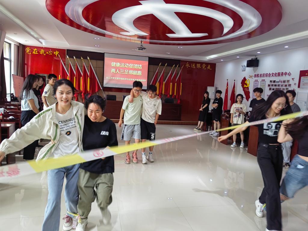 本网讯(见习记者 夏雪飞)为引导同学们积极参加体育健身活动,养成良好的锻炼习惯,增强同学们的凝聚力和向上力。5月15日下午,经济与法学系在四机社区新时代文明实践站开展了“健康运动促团结,两人三足绑腿跑”的主题活动。此次活动由经法系青年志愿者参与。