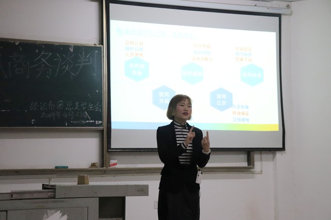 本网讯(通讯员 黄佳林)为了让参赛选手更加了解“模拟商务谈判”的比赛内容、谈判技巧、专业知识。4月21日晚上七点,经法系团总支在4教300教室开展了模拟商务谈判初赛赛前培训。培训工作特邀外语系李琳老师为同学们做指导。活动负责人文国霞、专任老师王颖两位老师参加赛前培训会。