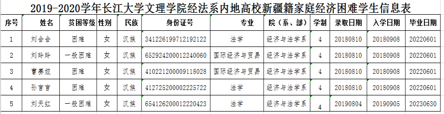 2019-2020学年内地高校新疆籍家庭经济困难员工资助金已由新疆维吾尔自治区教育厅划拨公司,根据新疆维吾尔自治区教育厅有关文件的要求,bevictor伟德官网经法系开展了2019-2020学年内地高校新疆籍家庭经济困难员工资助金的评审推荐工作。经我系员工个人申请、班级评议、系部审核,拟推荐以下5人为资助金获得者,现予公示。