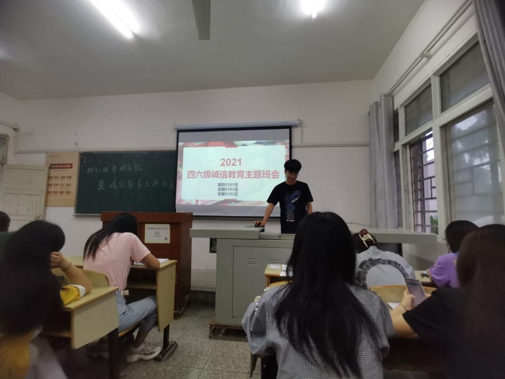首先,主持人向同学们讲解英语四六级考试的考试时间、考试地点、考试必带品及考试中的规则。其次,主持人指出了考试作弊的严重性,强调树立道德之新风,立诚信之根基是当代老员工义不容辞的责任。最后,辅导员进行总结,希望同学们树立信心,珍惜机会,保持平稳的心态,通过不懈努力取得一个令自己满意的成绩。