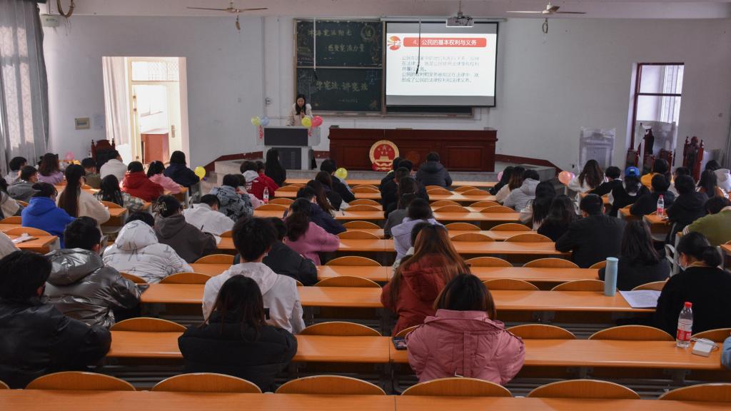 此次讲座围绕“以习近平法治思想为引领,深入学习宣传宪法”这一主题展开。活动开始,姜婷婷老师介绍了国家宪法日的由来。她强调,宪法是国家的根本大法,是治国安邦的总章程,是党和人民意志的集中体现。姜婷婷老师详细地介绍了宪法经历的五次修改及其构成、地位。她表示,宪法具有最高的法律效力和法律地位,并且鼓励同学们学习宪法、遵守宪法、维护宪法。接着,她向同学们详细地介绍了宪法所规定公民享有的权利和应履行的义务。