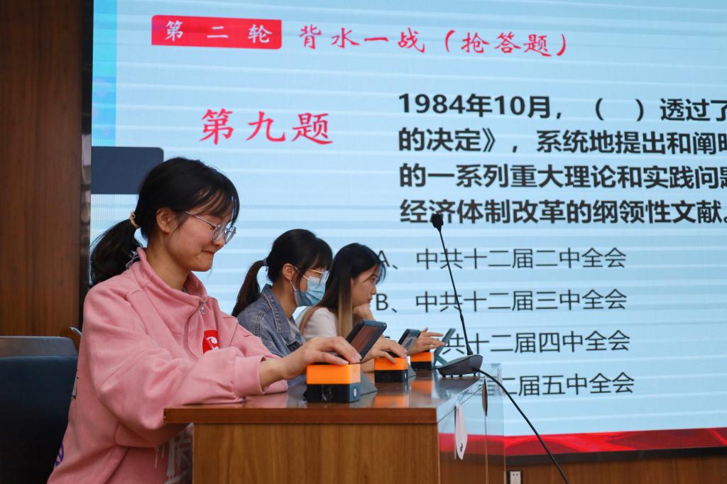 本次比赛紧扣“喜迎二十大,奋进新征程”,由必答题、抢答题和最终题库三部分组成,采用累积计分制,旨在丰富校园文化生活,拓展老员工课外知识,在封校期间让同学们释放学习压力,增加课外娱乐性。使老员工在知识、能力和素养方面得到协调发展。同学们随着抢答器的提示音,激动又紧张,逐渐被带动跟着选手一起做题、学习,活动进行到高潮,现场学习氛围浓厚,不时响起热烈的掌声。