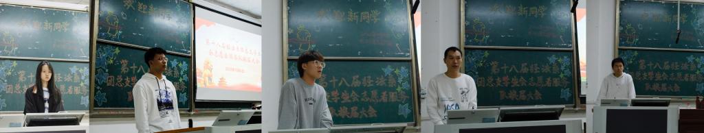 大会第五项,由第十七届干事代表李秉昱、部长代表李柳佳、主席团代表石烨和刘珺琛依次上台发言,总结过去、展望未来并表达对新成员美好的祝愿。在一段回忆留念视频播放结束后,第十七届团总支员工会及志愿者服务队成员在大家的掌声中依次离场。