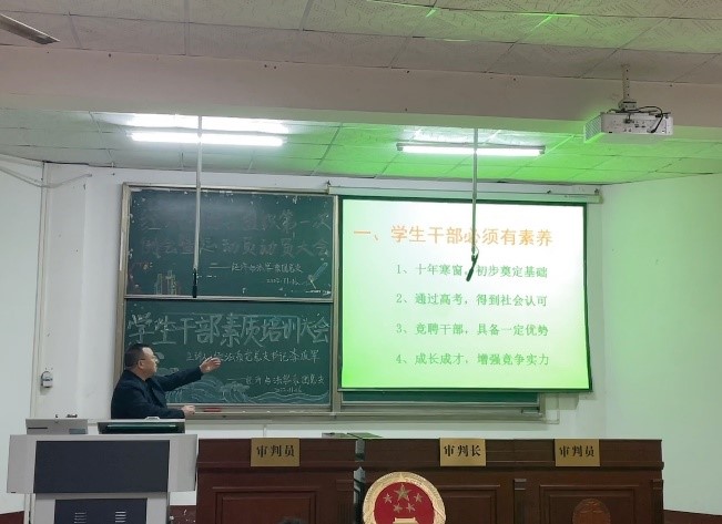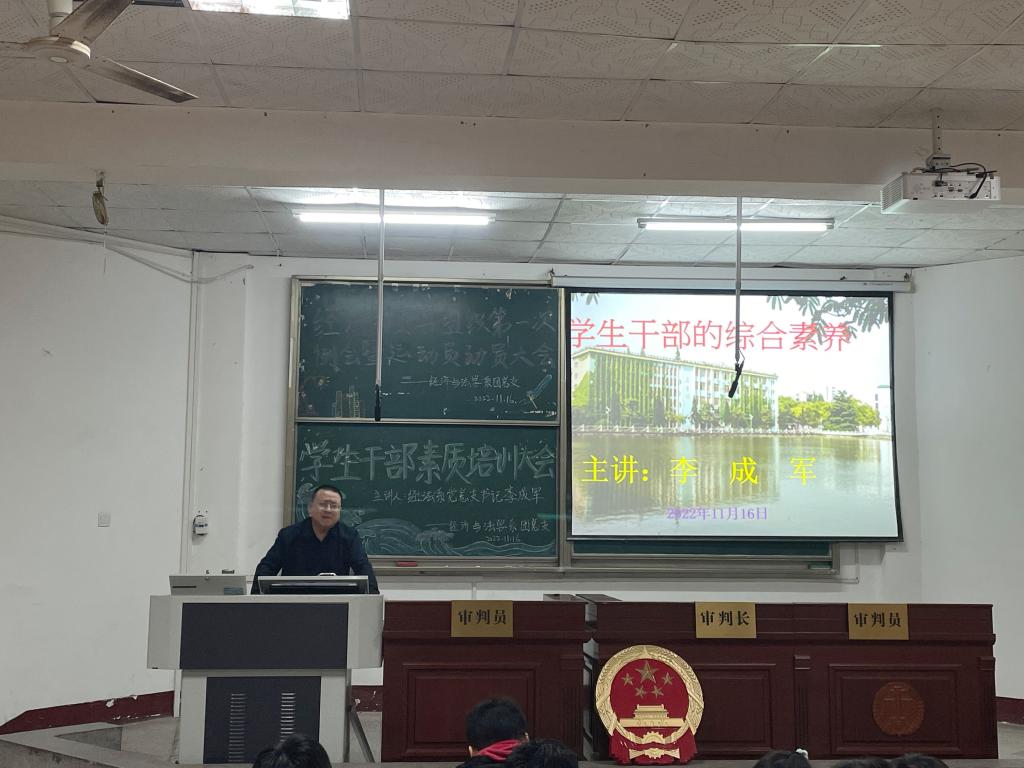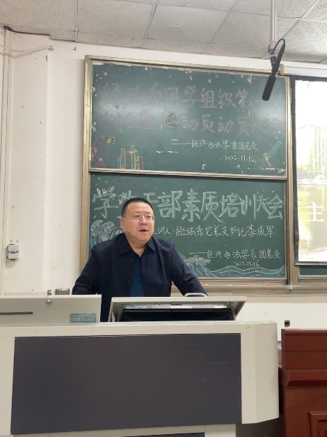 本网讯(见习记者:李欣怡)为了提高我系员工干部综合素养,加强员工干部队伍建设,保障后续工作的稳步进行,经法系于11月16日19:00,在4教300召开了员工干部素质培训大会。员工会全体成员参加此次培训大会,大会诚挚邀请到经法系党总支书记李成军老师为大家做培训,经法系辅导员卢佳智老师主持本次大会。