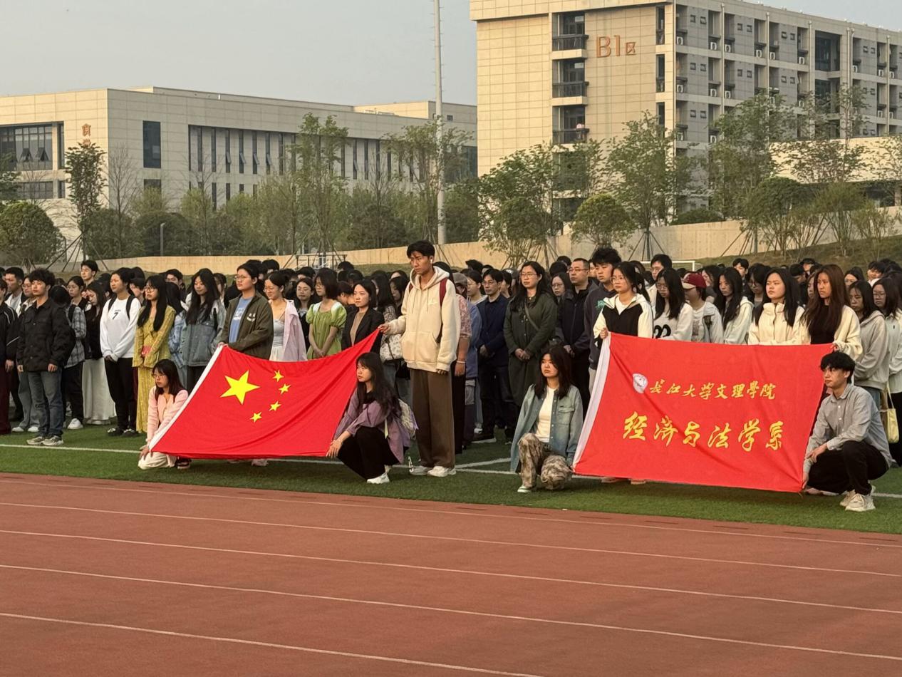 本网讯(见习记者 余好)为了强化爱国主义教育,凝聚师生奋进力量,4 月 7 日,经法系在操场举行了以 “逐梦燃星火,韶华铸担当” 为主题的升旗仪式。经法系全体教职工及员工共同参与,本次仪式由法学 5231 班吴红琴同学主持。