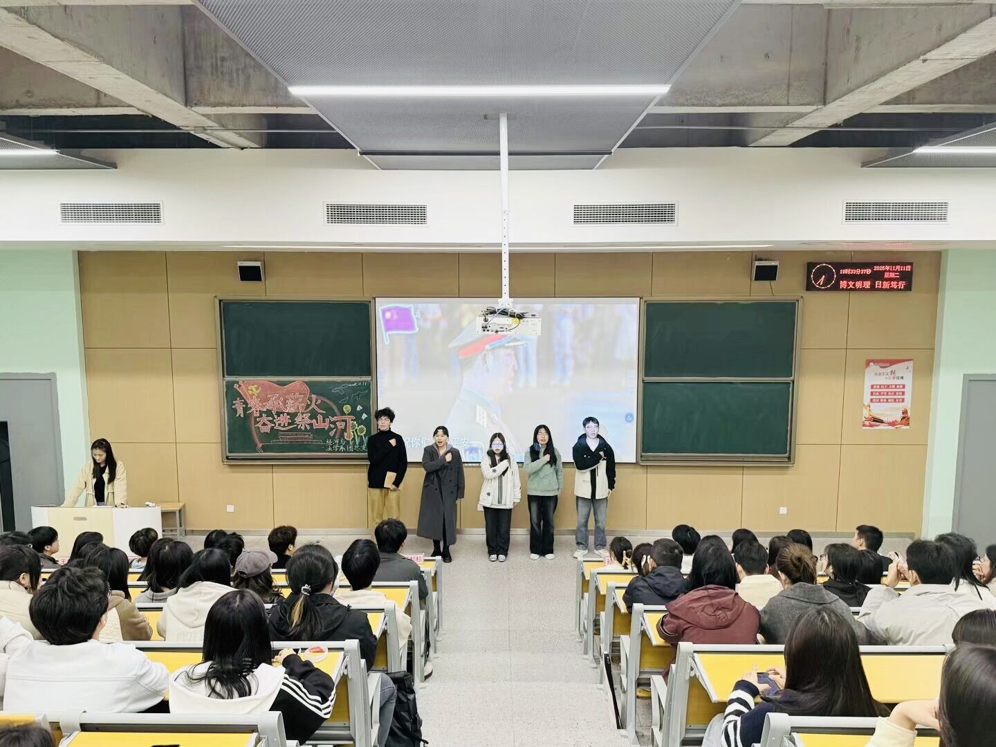 本网讯(见习记者:王宗琦)八十春秋流转,初心信念恒昌,抗战的热血与赤诚穿越时空,化作民族复兴路上的不竭动力,照亮前行征途。为铭记光辉历史,传承伟大抗战精神,加强对青年的思想政治引领,11月11日晚上,经济与法学系团总支在主校区教学楼B-213成功举办了“青春承薪火,奋进祭山河—纪念中国人民抗日战争暨世界反法西斯战争胜利80周年”主题团课公开课。系党总支副书记杨杉杉、系团总支指导老师卢佳智、辅导员刘曼莹莅临现场,与同学们共同参与了这场深刻而富有教育意义的精神洗礼,团课由秘书处冷誉岳、何俊雯主持。