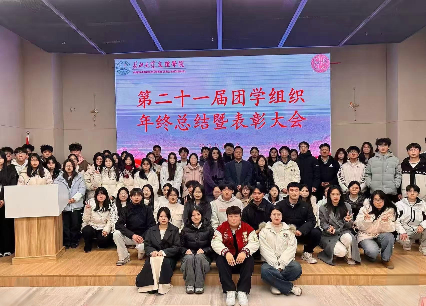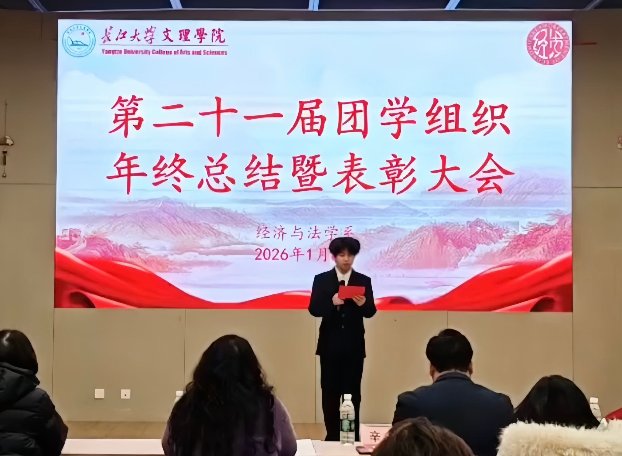 本网讯(见习记者:谭钱鑫)为全面总结2025年度团学工作成果,表彰先进典型,进一步凝聚青春力量,1月8日下午,经法系在图书馆103报告厅隆重召开第二十一届团学组织年终总结表彰大会。系党总支书记辛裕、系党总支副书记杨杉杉出席大会并发表讲话,辅导员卢佳智、滕宋云、刘曼莹、杨佳倩及全体团学组织成员共同参会。