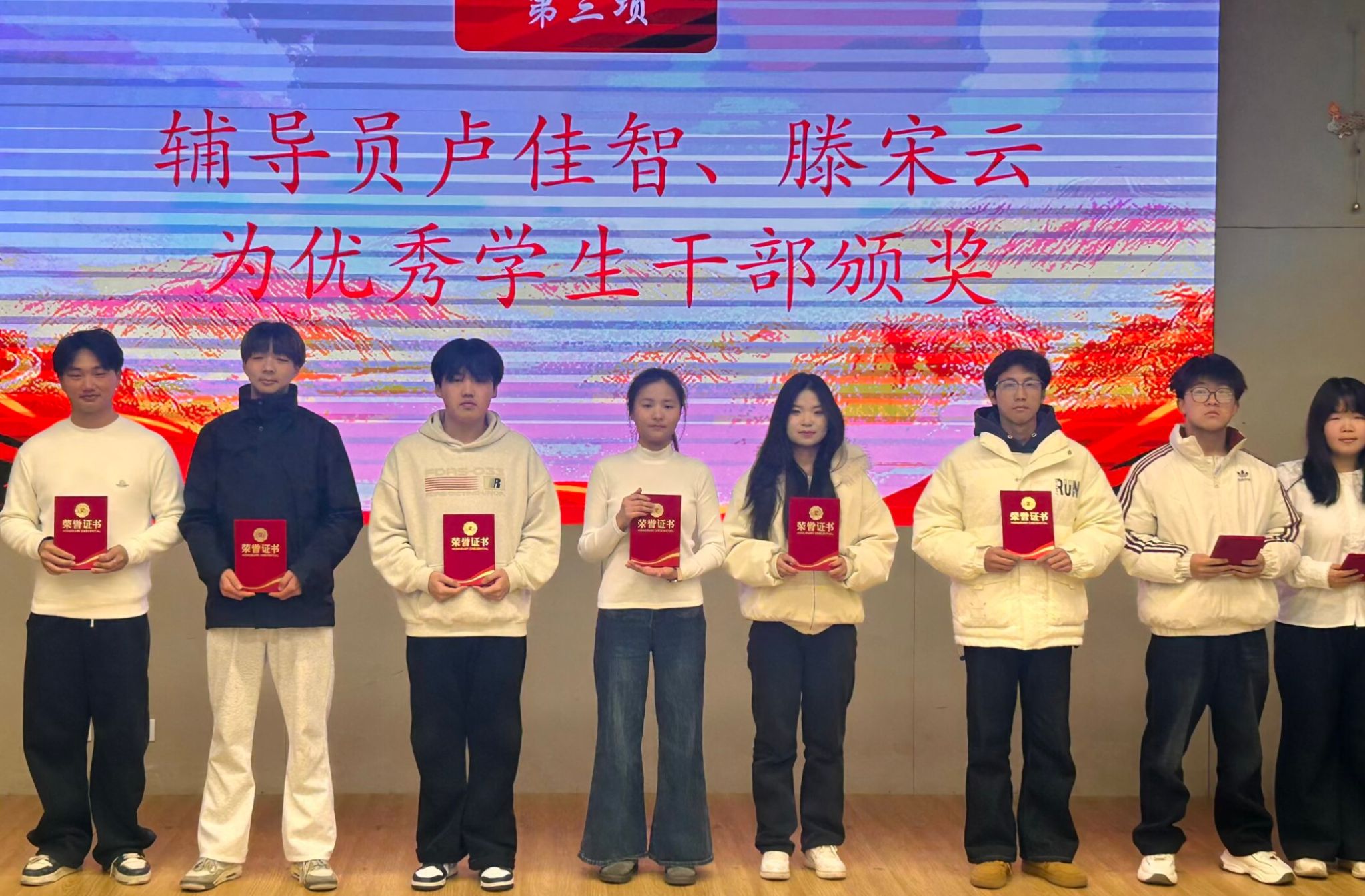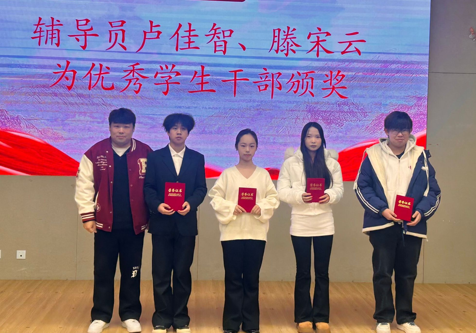 大会第二项,卢佳智宣读2025年度表彰文件。辅导员卢佳智、滕宋云为优秀员工干部颁发荣誉证书,辅导员刘曼莹、杨佳倩为优秀部门代表颁奖。
