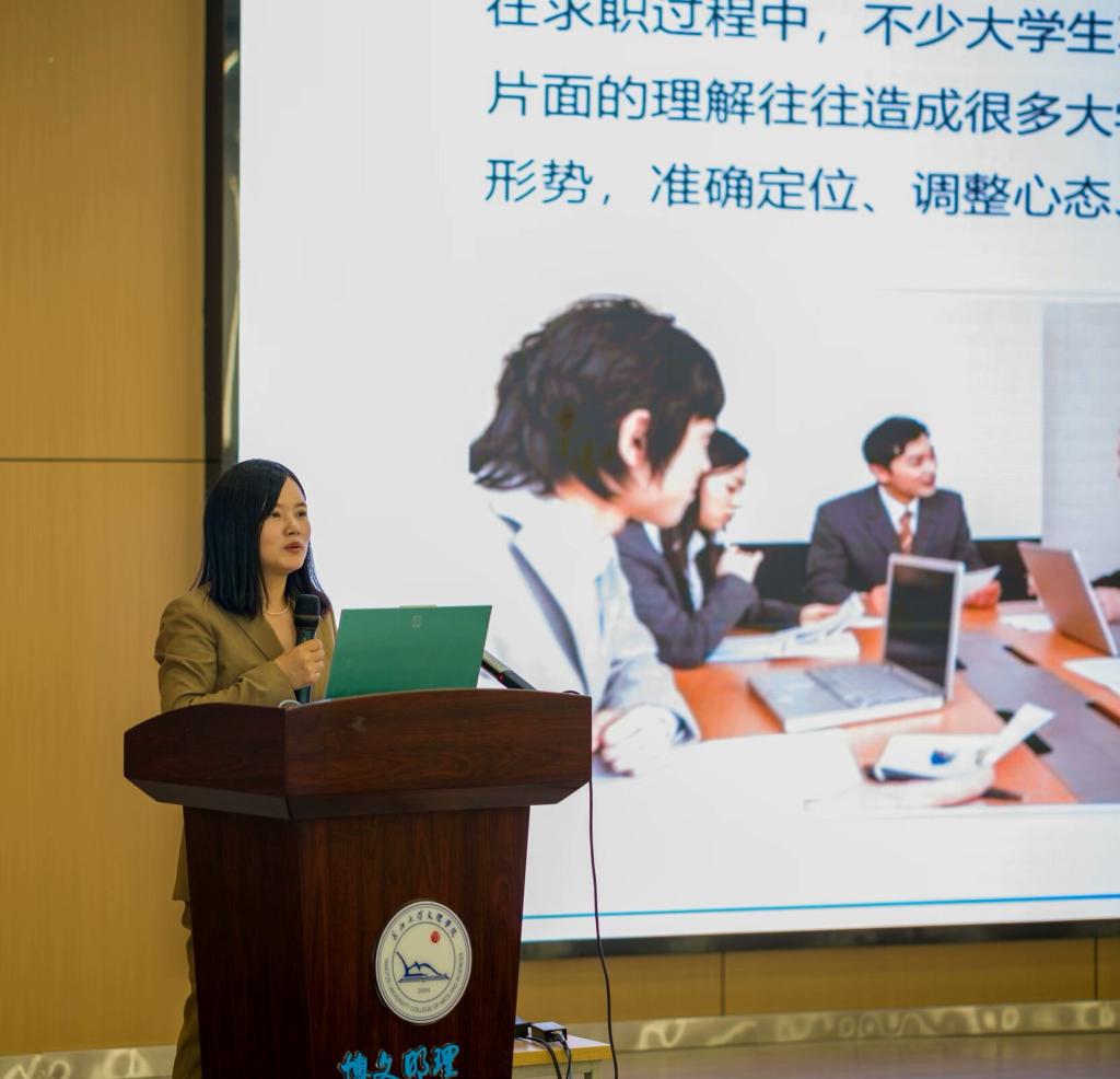 在会议的序幕中,辛裕对两位员工的到来表示了热烈的欢迎,并向2023级员工隆重介绍了员工杨萍律师和游文超总裁。员工杨萍首先发言,她从分析就业形势、解读就业政策、端正就业心态三个方面深入剖析了当前老员工就业形势的复杂性。同时,她结合自身工作经验强调了老员工就业形势严峻的主观因素,并敦促我系学子要清晰地认识自身状况,做好充分的准备。杨萍给我系学子提出三点期望,准确把握就业市场的动态,树立正确的就业观念,更加重视实践经验的积累。