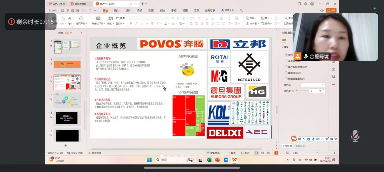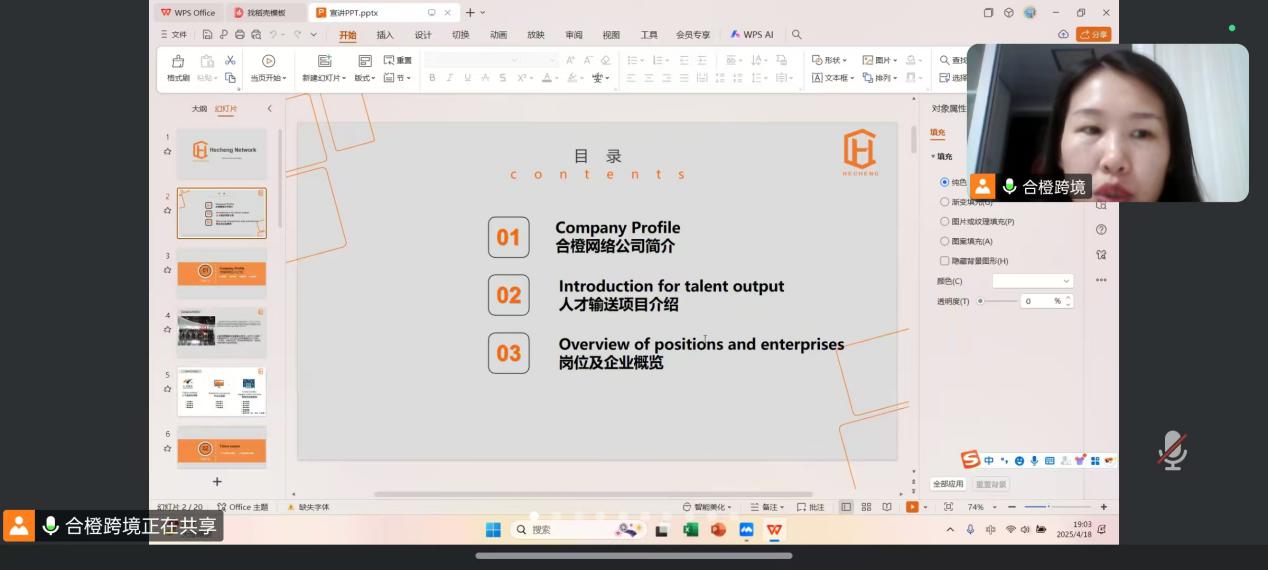 会议伊始,上海合橙网络科技有限公司负责人通过线上直播进行开场宣讲。她结合行业发展趋势,详细解读了跨境电商、国际贸易、国际物流等领域的人才需求动态,并围绕外贸业务员、跨境电商运营、国际商务专员等核心岗位,从岗位职责、任职要求、职业发展路径等方面展开说明。同时,负责人还介绍了公司作为人才服务桥梁的优势,强调将利用数字化平台资源,助力毕业生与企业实现精准匹配。负责人还强调,上海合橙网络科技有限公司全程提供技术支持与咨询服务,