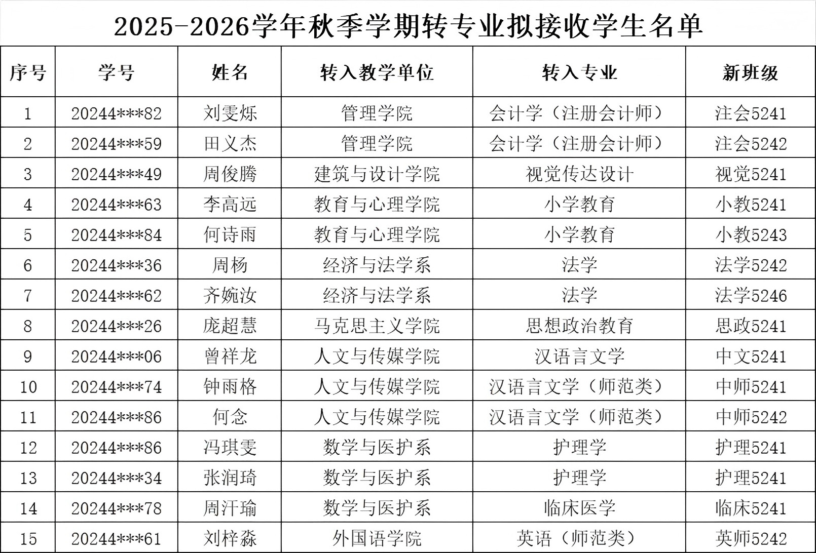 根据《bevictor伟德官网专业分流与转专业管理办法》(文理行发〔2025〕21号)文件精神,按照转专业相关工作要求,经员工本人申请,招生处及所在教学单位审核,申请转入教学单位综合考核,教务处复核,拟同意刘雯烁等15名同学转入新专业学习,现将结果予以公示(见附表)。