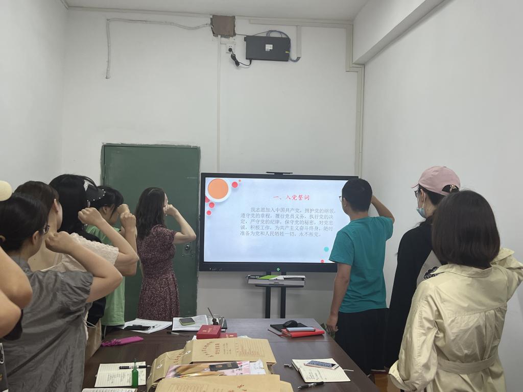 最后,全体党员教师开展支部主题党日活动。全体党员重温入党誓词,并按时缴纳党费;集体诵读《中国共产党章程》第六章。