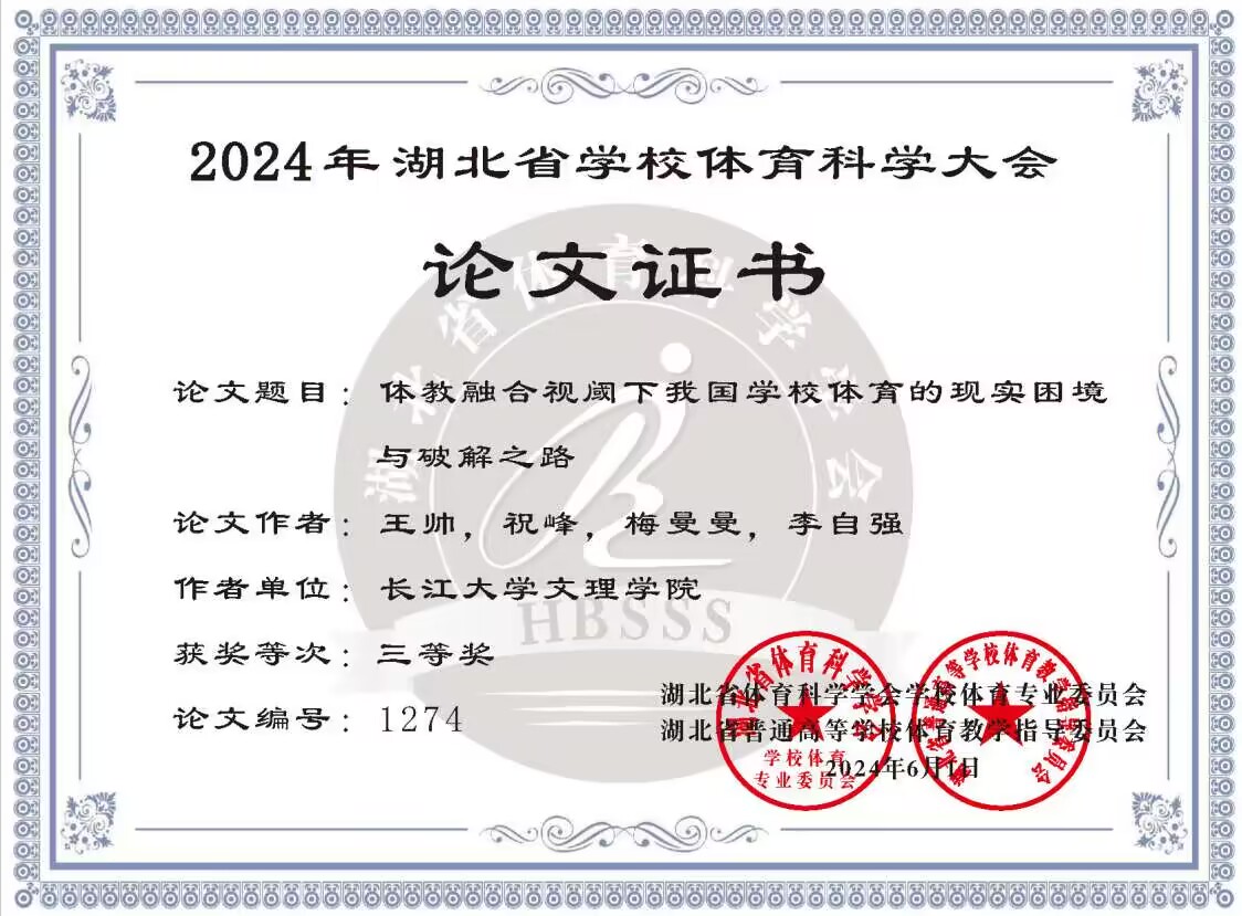 据悉,本次大会共收到来自全省各有关单位和个人报送的论文1741 篇,经论文学术不端系统检测、人工筛查和专家评审等程序,录取论文1082 篇,公司教育与心理公司教师王帅、祝峰、梅曼曼等人撰写的论文《体教融合视阈下我国公司体育的现实困境和破解之路》获三等奖。