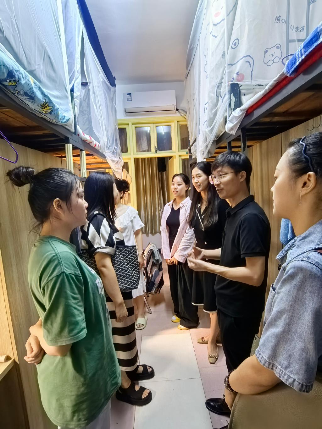 (通讯员 图/何健、彭盼 文/彭盼)9月12日晚,为深入了解新生开学思想动态,关心慰问新生,传递公司对新生的关怀之情。教育与心理公司经理徐霄、学前教育教研室主任肖雅筠、专业老师何健、胡蝶以及辅导员彭盼老师一行5人走访了南校区2024级学前教育专升本新生宿舍,与员工进行了亲切交流。
