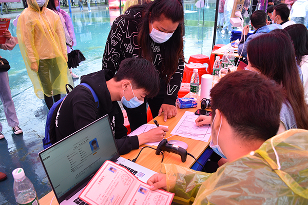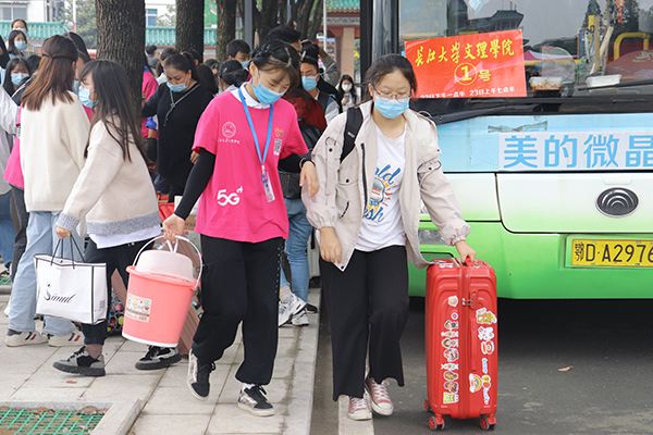 经理王文凯(右一)、党委书记朱继平(右二)进寝室看望新生